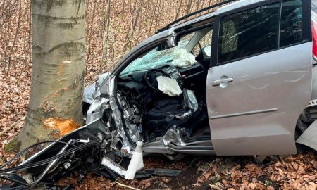 Jazda drogą z Tenczynka do Frywałdu zakończyła się dla kierowcy srebrnej mazdy na przydrożym...