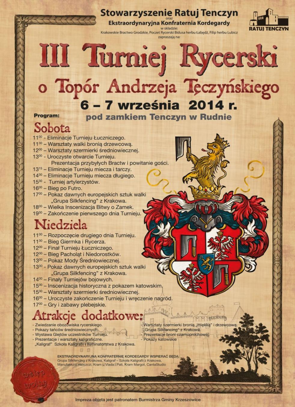 Trzeci Turniej Rycerski o Topór Andrzeja Tęczyńskiego, organizowany przez Stowarzyszenie Ratuj Tenczyn, rozpoczną eliminacje turnieju łuczniczego (sobota, 6 września, godzina 11:00). Na imprezie każdy znajdzie coś dla siebie. Poza turniejami – łuczniczym i mieczowym, organizatorzy przewidzieli pokaz średniowiecznej mody, bieg o futro czy gry i zabawy plebejskie. Nie zabraknie również inscenizacji bitwy o zamek.