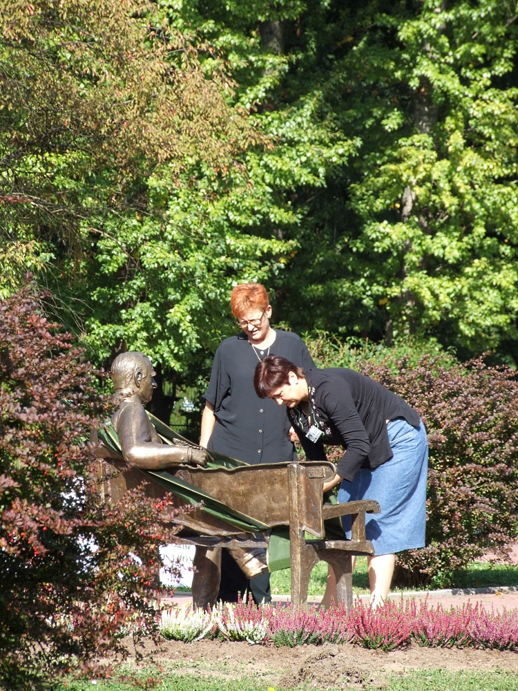 Przed południem trwały ostatnie przygotowania do jutrzejszego odsłonięcia. Pomnika na placu stoi już od kilku dni, w piątek wokół ławeczki dosadzano wrzosy. Naturalnych rozmiarów odlew z brązu to praca Michała Batkiewicza, artysta którego wystawę mieszkańcy miasta mogli podziwiać na krzeszowickim rynku w maju zeszłego roku. Pomnik kosztował 40 tysięcy złotych.