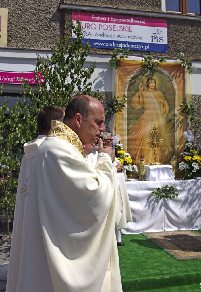 Wydaje się, że miejscowi zdążyli się już przyzwyczaić do czegoś, co w osłupienie może wprawić niejednego przyjezdnego. Od lat, jeden z ołtarzy tworzonych na Boże Ciało, umiejscowiony jest przy kamienicy w której mieści się biuro poselskie pochodzącego z Krzeszowic ministra w rządzie PiS – Andrzeja Adamczyka.