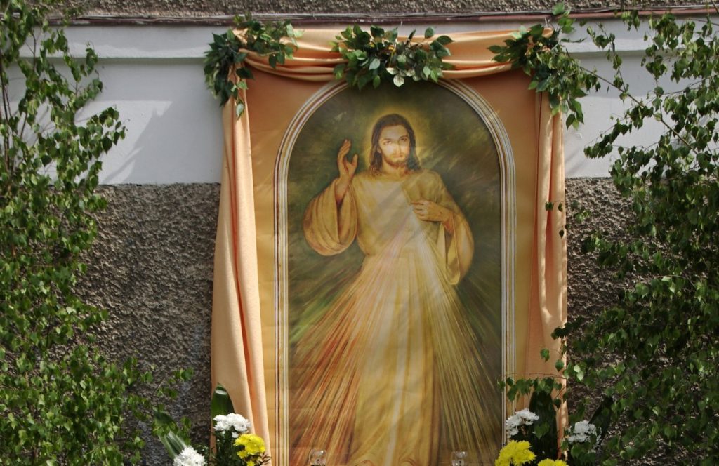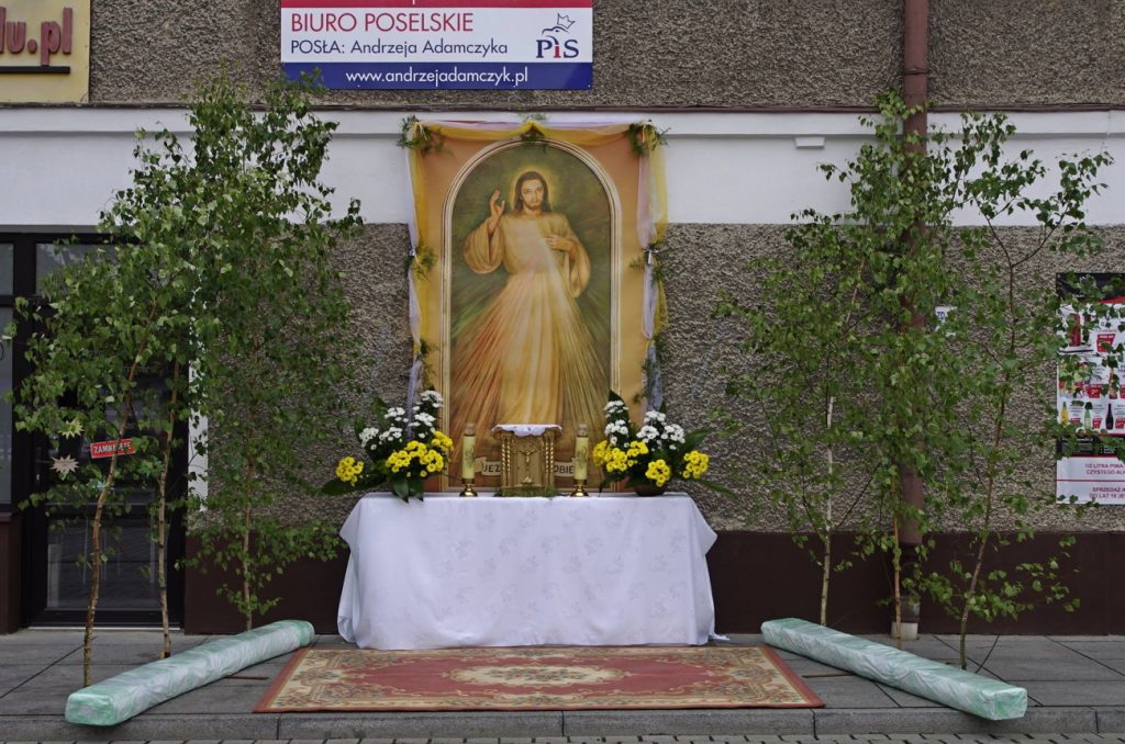Choć budynek jest długi, ołtarz z obrazem Jezusa Chrystusa zawsze umiejscowiony jest tuż pod bannerem informującym o właścicielu biura. Nie inaczej było w tym roku. Ze względu na trwającą kampanię, na kamienicy doszedł jednak nowy element – banner wyborczy urzędującego prezydenta. Jezus z ołtarza znalazł się w tej hierarchii na trzecim miejscu, tuż pod bannerem Andrzeja Dudy i szyldem Andrzeja Adamczyka.