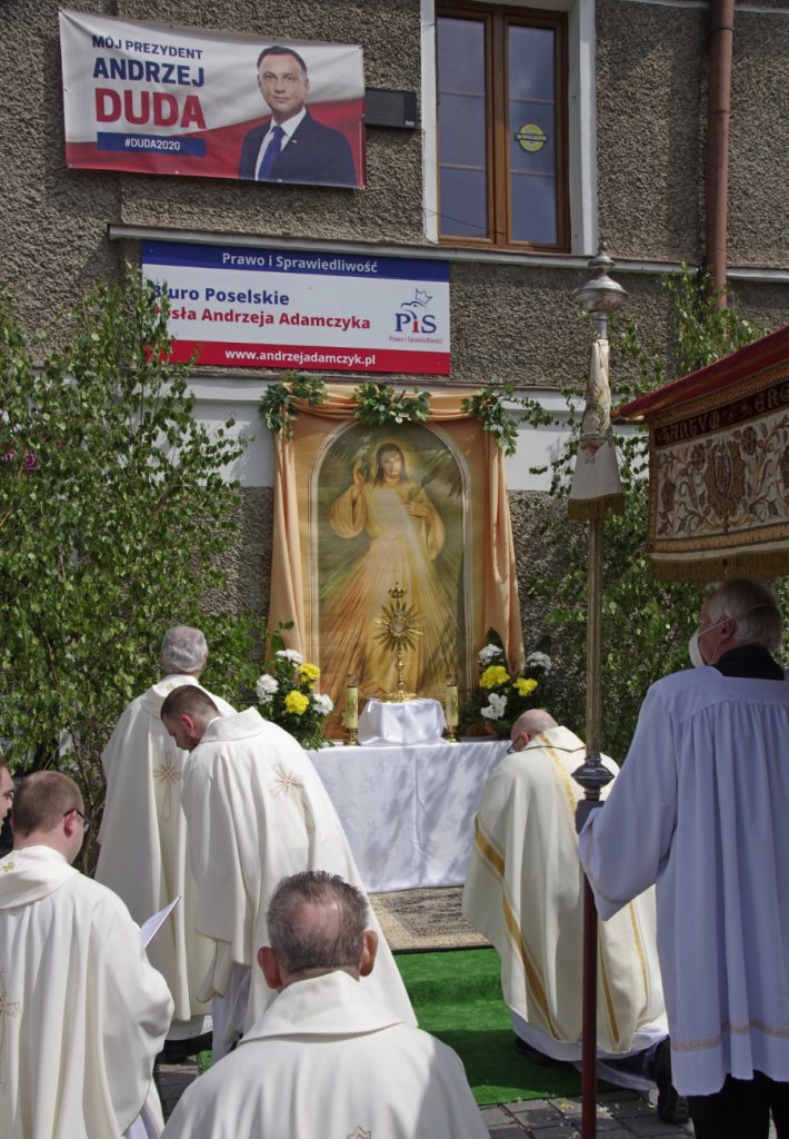 To wystarczyło by w sieci rozgorzała dyskusja. Zdjęcie krzeszowickiego ołtarza nad którym wisi banner wyborczy zamieścił na swoim profilu poseł KO Aleksander Miszalski pytając „do kogo modlą się uczestnicy procesji Bożego Ciała w Krzeszowicach?”. Na swój twitterowy profil zdjęcie z ołtarzem wrzucił też były minister w rządzie PiS, Janusz Kaczmarek, przytaczając pierwsze przykazanie: „Nie będziesz miał cudzych bogów przede Mną”.