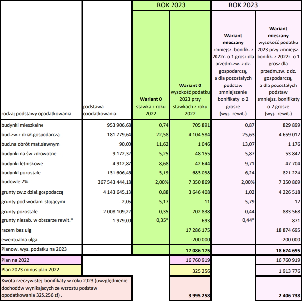 Radni, z czterech zaproponowanych wariantów, wybrali „kompromisowy” (mieszany). Dzięki niemu do przyszłorocznego budżetu ma wpłynąć podatkowe około 1.9 miliona złotych. Stawka podatku od budynków mieszkalnych wzrośnie z 0,74 złotych do 0,87 złotych. Opłaty za budynki związane z działalnością gospodarczą z 22,58 złotych wzrosną do 25,63 złotych. Wyższy będzie także podatek od gruntów – tych związanych z działalnością gospodarczą z 0,88 złotych na 1,02 złote, a pozostałych z 0,35 złotych do 0,40 złotych (po autopoprawce, pierwotnie stawka miała wynosić 0,44 złotych). Radni zmniejszyli także bonifikatę dla mieszkańców i przedsiębiorców. Nowe stawki wciąż mają być konkurencyjne w porównaniu do sąsiednich gmin.