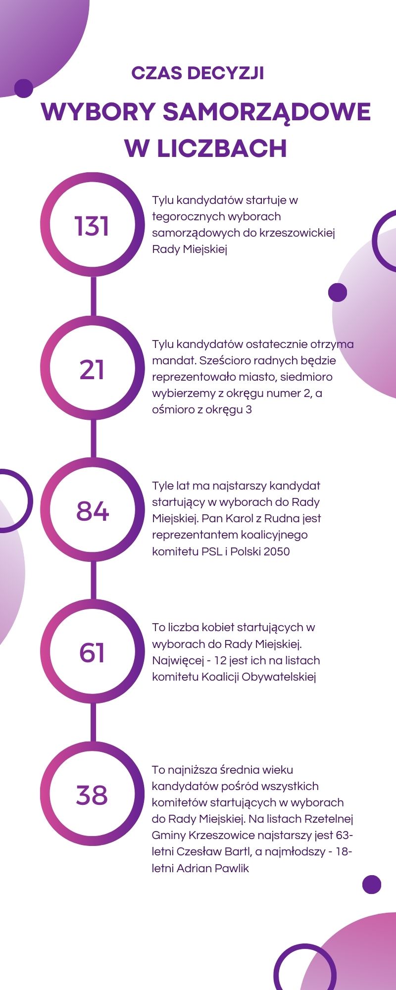 Średnio sześć osób ubiega się o jeden mandat w krzeszowickiej Radzie Miejskiej, trzech walczy o fotel burmistrza. Zainteresowanie wyborami samorządowymi jest na tyle duże, że kandydaci dwoją się i troją, walcząc o naszą uwagę.