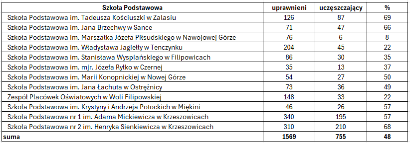 Termin na podjęcie decyzji minął 25 września. Jak dziś prezentuje się frekwencja na nieobowiązkowym przedmiocie? W gminie Krzeszowice będzie na niego uczęszczać 48% dzieci z klas IV – VIII. Najwięcej w podstawówce w Zalasiu (69%), krzeszowickiej dwójce (68%) oraz szkole w Sance (66%). Najmniej w Nawojowej Górze (8%), Tenczynku (22%) oraz Woli Filipowskiej (22%). Na niską frekwencję w tej ostatniej miejscowości wpływ może mieć apel miejscowego wikarego, który w ogłoszeniach parafialnych przestrzegał, że żadne katolickie dziecko nie powinno zostać zapisane na deprawujące zajęcia.