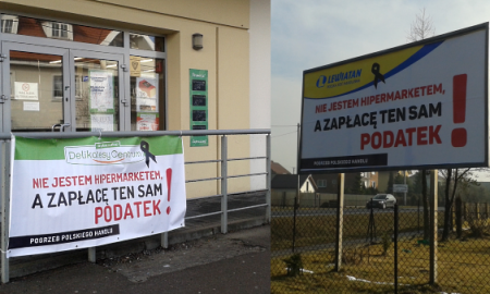 „Nie jestem hipermarketem a zapłacę ten sam podatek! Pogrzeb polskiego handlu”. Bannery z takim napisem, opatrzone dodatkowo żałobną wstążką, wciąż wiszą na...