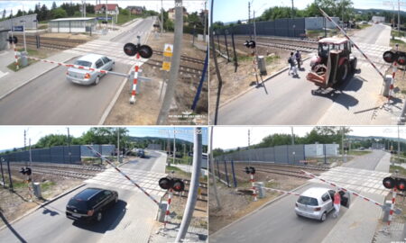 Rozpędzony samochód wjeżdża pod opadające rogatki na przejeździe kolejowym, mimo, że tuż przed nimi już mruga czerwone światło ostrzegawcze. Taki widok zarejestrowały...